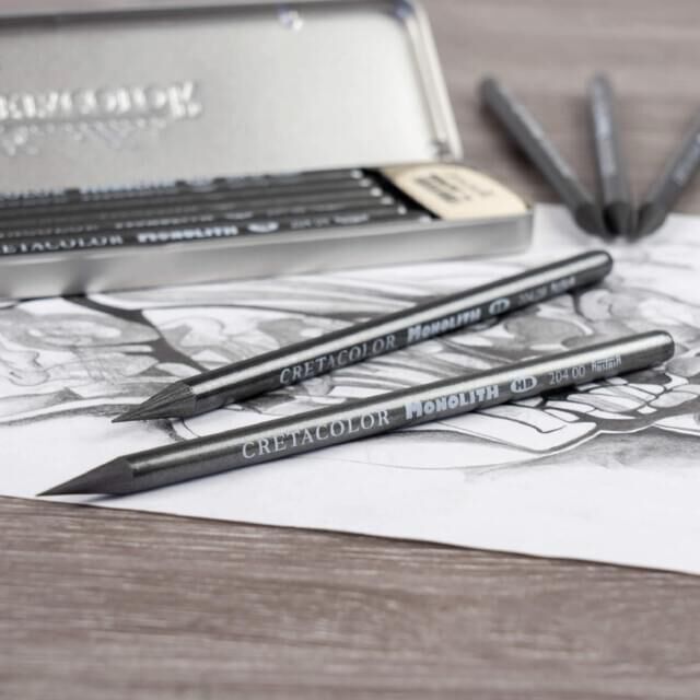 Cretacolor Monolith is a large, 7.5mm diameter, woodless, graphite, artists pencil, which is covered in a thin layer of plastic to prevent smudging and to protect the fingers from soiling. They lay down smooth and intense shades and are ideal for both portrait and landscape sketching. Broad strokes, subtle shading and fine line work are all possible.